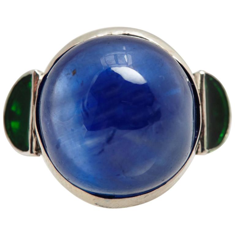 This ring (offered by a now mystery dealer in NY) is described as “A platinum ring showcasing a cabochon Burmese blue sapphire – non heated- weighing 18.91 cts, sided by two half moon shaped emeralds. Circa 1965.” Its selling price is USD$150,000. For that money, I definitely want to know the name of the seller with whom I’m dealing.