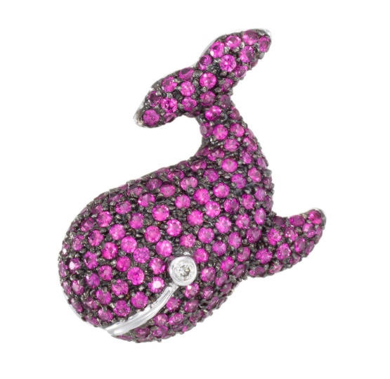 I am still a sucker for a great brooch and this little critter can also be worn as a pendant – bonus! From Ruby Lane seller Sophie Jane, based out of California, she notes, “Pink sapphires total an estimated 3 carats and are pave set into the blackened gold mount. One approx. .05 carat round brilliant cut diamond adorns the eye (estimated at I color and SI2 clarity). Weight: 8 grams Stones: Pink sapphires total an estimated 3 carats and are pave set into the blackened gold mount. One approx. .05 carat round brilliant cut diamond adorns the eye (estimated at I color and SI2 clarity). The pendant is 1.25 x 1 inch. Metal & Hallmark: 14k white gold. The pendant is hallmarked “14k”.”