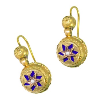 There is something about blue enamel on yellow gold that is timeless and classic. These earrings, which look to be Victorian, are offered by Australian firm Gray Reid. No price or details on the item so contact the vendor if you are interested in purchasing.