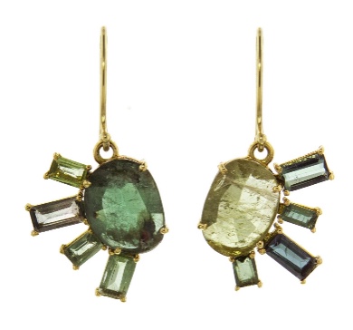These pretty asymmetrical earrings are by designer Eva Noga. They feature tourmalines in various shapes and colours set in 18k yellow gold, adding to the fun of the final design. They measure measures 1 3/16-in.long. Available from Ylang23, these sell for USD$725.