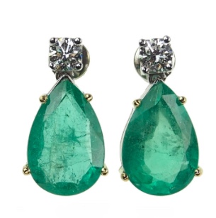 German antique jeweller Rheinfrank has these for your consideration. They note the 18k gold stunners have a total emerald weight of 9 carats; total diamond weight is .07 carats. These likely date back to the 1960s. Each is about .75 inches long, by .39 inches wide, and weighs 3.15 grams.