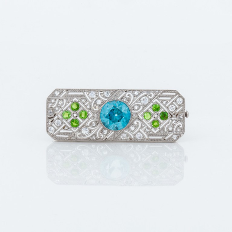 Bring on the brooches, even if you really have to look at antique pieces for some of the most mouthwatering examples. This pin offered by Tenenbaum Jewellers is platinum set with rare demantoid garnets, a natural blue zircon, and 1.20 carats of diamonds.