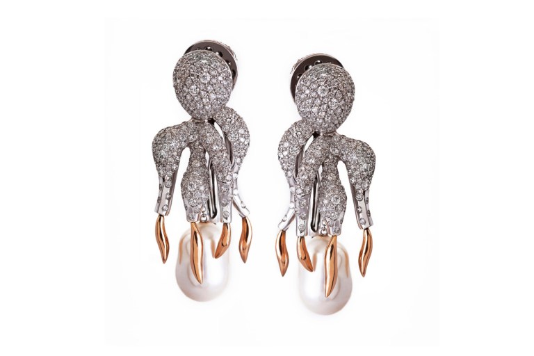 By Gaelle Khouri, the description notes, “These striking diamond octopus earrings are a true conversation point. Fashioned in 18ct white gold and 18ct rose gold, the octopi’s heads and legs sparkle with white diamonds, while at the centre of each chandelier earring are two natural baroque pearls.”