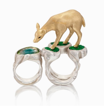 Nothing like having a tableau on your hand, in this case, a deer wandering the forest in two rings. By Manya and Roumen, this is made of 18k yellow gold, sterling silver, uvarovite garnets, diamonds, onyxes, and tri-color tourmaline. It sells for USD$12,000.