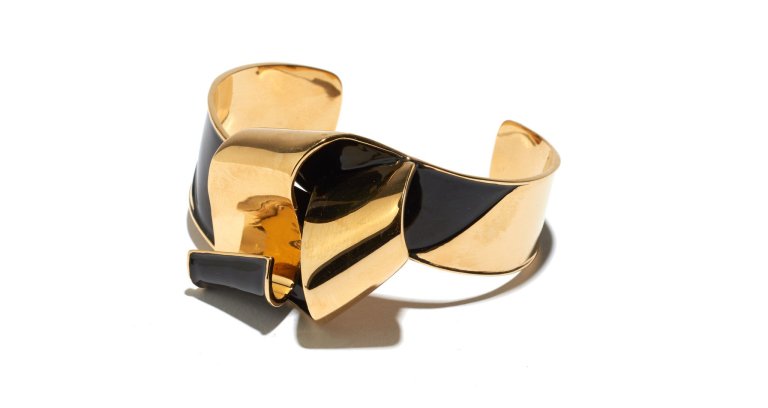 This gold-plated (over brass) cuff bracelet by Lizzie Fortunato mixes black enamel accents with a sculpted design. It’s elegant and edgy and would work as well in the workplace as at brunch on the weekend. Sells for USD$125.