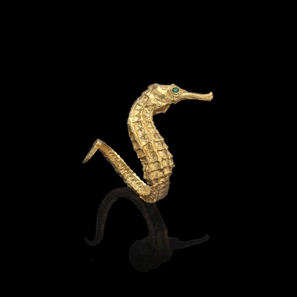 The seahorse form lends itself well to jewellery, in this case, a perfectly proportioned ring. By Catherine Zoraida, it is sterling silver with gold plate. This model has a green crystal eye but you can personalize this with a different colour stone and engraving, should you wish.