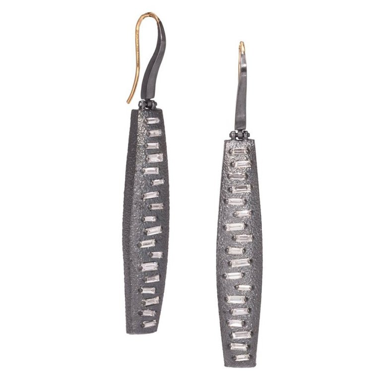 There is no designer name attached so these may be part of Sedoni Gallery‘s own collection. They note that these earrings are made of richly textured, oxidized sterling, set with 36 total white diamond baguettes. Hinged earwire, gracefully curved and tapered with 18k earwires. The playful irregularity of the baguette angles catch the light in exciting ways. 1.1104 tcw.