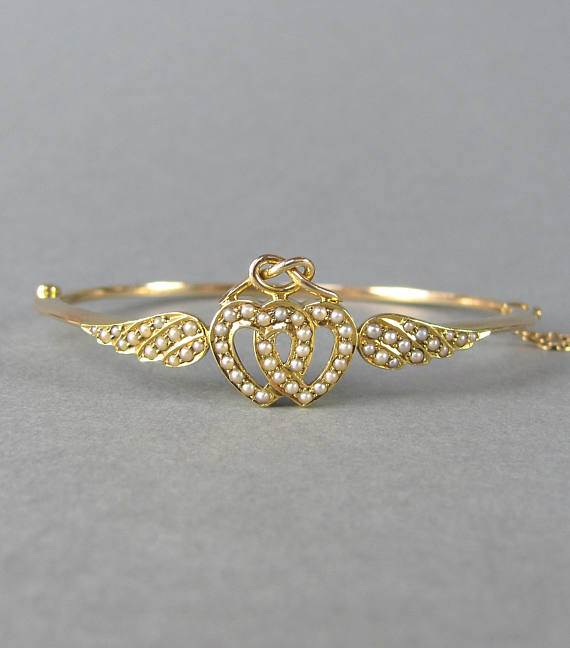 This pretty Edwardian bracelet by Etsy seller Leola Revives is still very wearable today, easily 100 years later. It features seed pearls set in 14k yellow gold in a heart and wing design. Engraved with a 1907 date, it was likely a wedding or anniversary gift. It is unmarked, so potential American or Continental in origin.