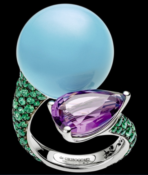 This ring is made with turquoises, amethysts and tsavorites in white gold; find out more on the De Grisogono site.