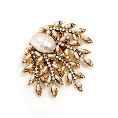 This brooch is custom made (so it will take up to 7 weeks to be made and shipped). It features glass rice pearls and Swarovski crystals set inside Russian gold plated leaf findings with a large button baroque glass pearl center. The pin measures 3.5 inches at its widest point.