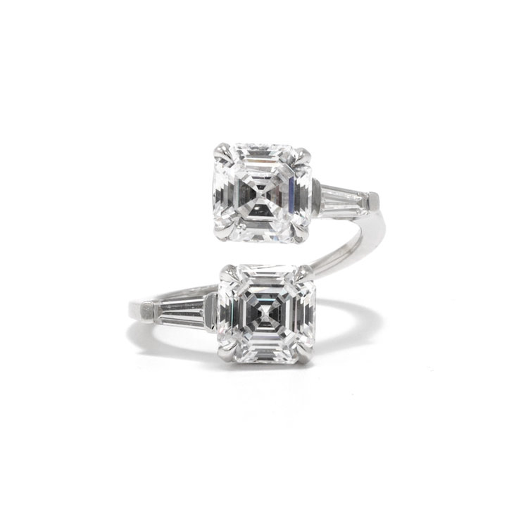 Her site notes, “The Margaret Asscher cut engagement ring is an open wrap design ring with two asscher cut diamonds accented by tapered baguette diamonds and a rounded square band. This ring was inspired by traditional “Toi et Moi” style engagement rings, meaning you and me in French, with two stones making up one engagement ring. Each ring is custom hand-made to order in 2-3 weeks. Requested modifications are subject to revised production timelines and pricing. Shown with two 1.5 carat asscher diamonds.”