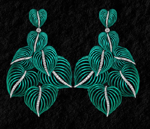 I like the size but light weight of these diamond encrusted earrings by Jacob & Co. They are light because … titanium. The site notes, “The beauty and light filled forms of the swaying fronds on Las Palmas are Jacob & Co.’s muse for this open design organic shaped collection. Both the earrings and rings are hand crafted of very easy to wear lightweight titanium with green, blue, red and multi-color ceramic coating. White diamond accents on the flexible leaves sparkle like dew in the morning sunshine on the tropical island. Available in varying sizes and finish combinations, Las Palmas is the perfect way to feel the warmth and sultry styles of the islands no matter where they are worn.”