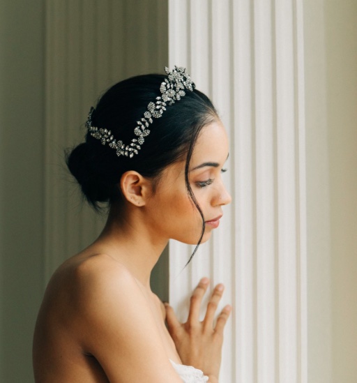 Jennifer Behr makes lovely modern head bands, tiaras and coronets, notably her Cecilia model, shown below. Her site notes, “The coronet is a signature Jennifer Behr style. It is a deconstructed modern tiara that rests comfortably and securely on the head due to it’s flexible design. The Cecilia Coronet features flattering height and Swarovski crystal leaves and flowers. This headpiece has Swarovski crystal detailing on the full 360 degrees. The Swarovski crystal leaves and flowers continue around the back of the headpiece. This headpiece can be worn with hair up or down. Can be worn with a long, simple veil for one’s wedding day. Each Swarovski crystal is set by hand to ensure the highest quality. Handmade in New York City.”