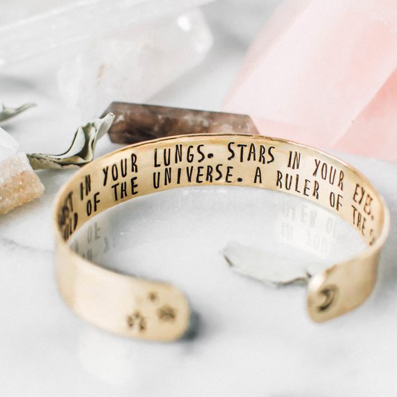 This piece by Etsy seller Zenned Out features a quote inside the bracelet, which I think is a nice touch as this makes it extremely personal to the wearer – just what jewellery should be about. The quote says, “Moon dust in your lungs. Stars in your eyes. You are a child of the universe. A ruler of the skies,” stamped onto the brass bracelet.