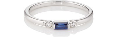 They note, “Featuring modern birthstone jewelry, My Story sculpts The Olive stackable band from sparkling gemstones and white gold. Finished with a polished surface, this style showcases two bezel-set white diamonds that frame a baguette blue sapphire, the stone akin to the month of September. Diamonds rest in bezel settings. Baguette blue sapphire. Round white diamonds. Polished 14k white gold. 2mm band width (approximately).”