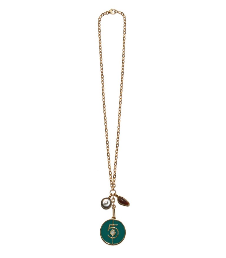 If five is your lucky number, this could be your lucky day. for the gambler in your life, this necklace by Lizzie Fortunato features a “5” poker chip style pendant with other talismans.
