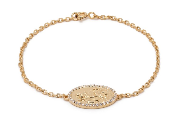 This bracelet by Theodora Warre feature St. Christopher, patron saint of travellers. Vendor Matches Fashion says, “gold-plated sterling-silver bracelet comprises a fine chain decorated with a white zircon-embellished St Christopher charm – in honour of the patron of travellers. Crafted as a symbol of protection, it’s a delicate style that will add a discreet touch of sparkle to ensembles. Let it shine against a bright red dress.”