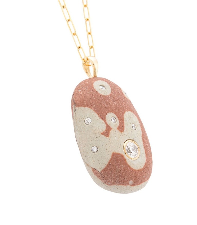 It features a stone inset with diamonds in 18k yellow gold, and comes with an 18k yellow gold chain.