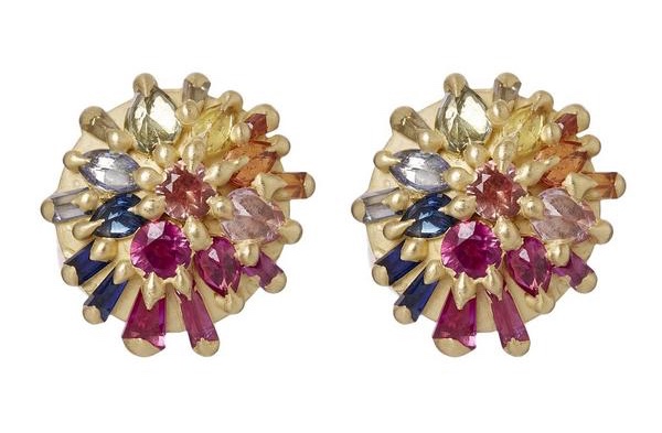 These are set with multicoloured sapphires in 18k yellow gold. Vendor Liberty London explains, “Polly Wales’ Collette Couture stud earrings are little domed discs cast in gold and encrusted with an array of rainbow-hued sapphires.