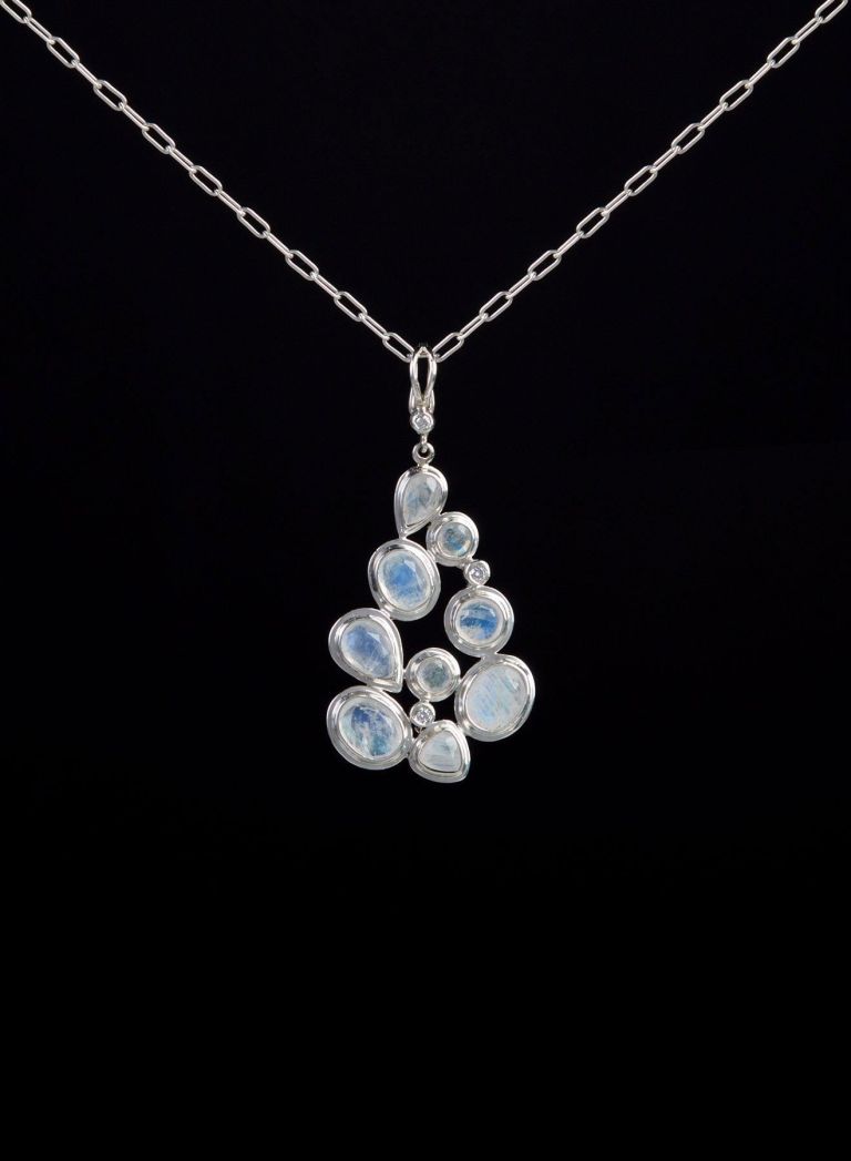 By Darby Scott, this has sparkle and shine. It features moonstones and diamonds set in sterling silver on a 30” long chain. There are also several matching rings should you prefer a set.