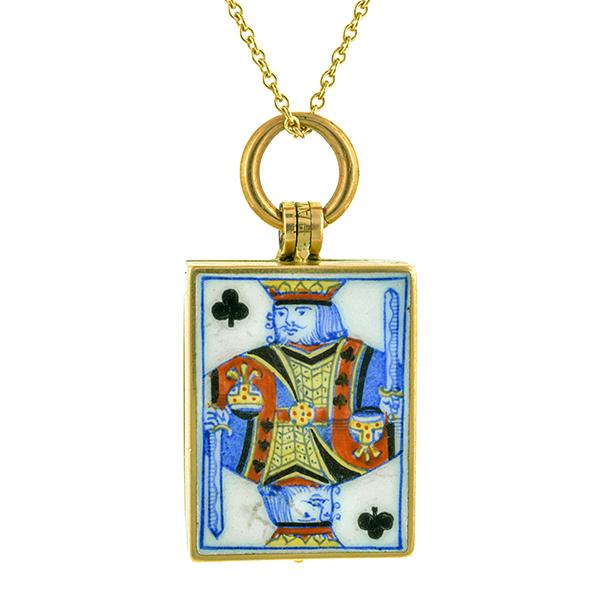 Seller Doyle & Doyle notes, “Measuring approx. 1 1/4 x 5/8 inches. One side with an enamelled King of Spades card. The opposite side with a bloodstone tablet, suspended from 18 inch 14k chain. Fashioned in 15k yellow gold. Engraved “PATENT” on hinge. Circa 1890.”