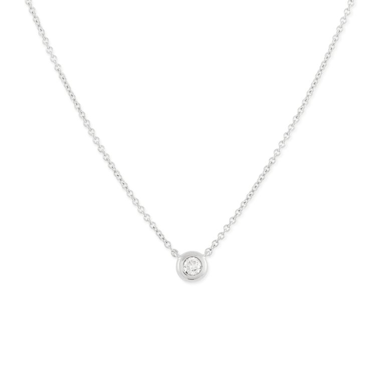 This diamond solitaire pendant features a petite .06 carat bezel set stone set in 14k white gold with an attached chain. It sells for Cdn$375; also available in yellow gold.