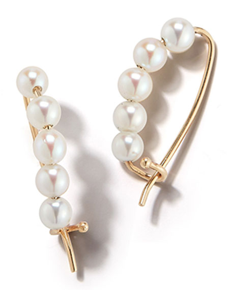 These sweet earrings by Mizuki are very reminiscent of Victorian pearl pins, generally worn on the collar. Their small size makes them perfect for a modern reinterpretation as earrings. These have white dyed Ahoy cultured pearls on a 14k yellow gold wire.