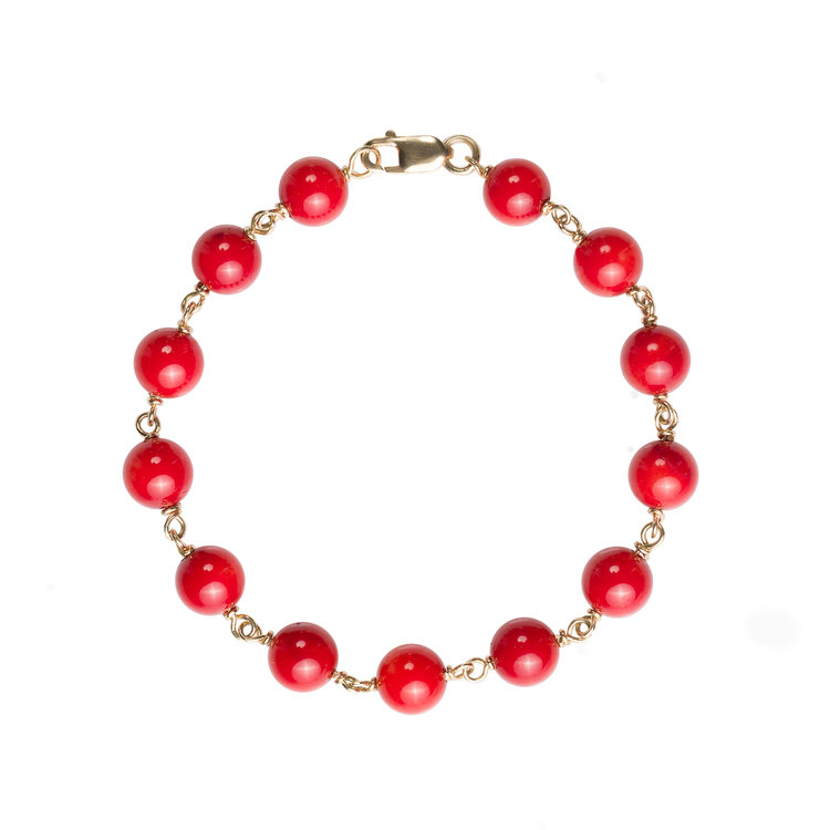 Norwegian-based Libelula Jewellery offers fine jewelry, classic with a bit of an edge. This red coral and 18k yellow gold bracelet would pair well with an existing stack or watch; it is also offered in other semi-precious stones.