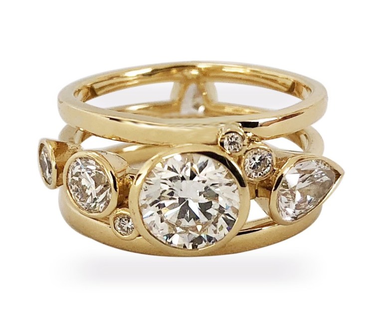 I know I’d want to do a high five if this turned up on my hand. By Danish designer Josina, this ring features 2.63 carats of what they accurately term serious glamour, set in 18k yellow gold attached bands. It’s an instant stack, basically.