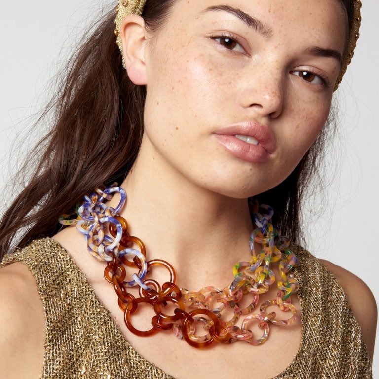 I love the way Lele Sadoughi used an almost confetti type of acetate mixed with more traditional faux tortoiseshell. It brings something a little unexpected to the eye – and to the wearer.