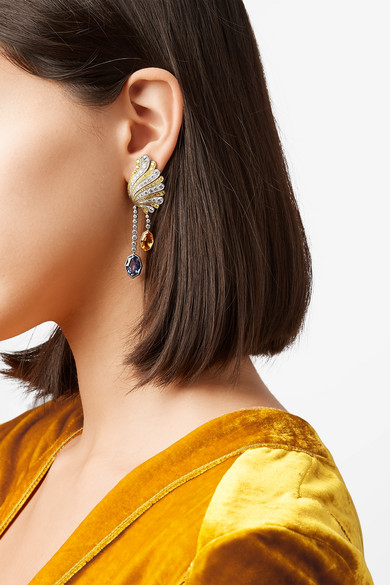 These earrings are by the renowned firm of Buccellati. Vendor Net-A-Porter notes, “Buccellati’s pieces are handmade by two members of the family, both from different generations – the seasoned goldsmith brings years of experience while the younger one offers a fresh new perspective. Part of the brand’s ‘Unica’ collection, these earrings are cast from 18-karat yellow and white gold and encrusted with over 200 stones that beautifully accentuate the wavy shape. The striking sapphire and yellow diamond-tipped strands can be detached for a more pared-back look.”