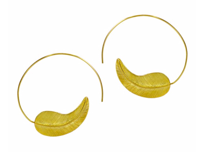 The site notes, “Finished with a stunning brushed texture, these beautiful gold earrings feature a stunning feather detail and have been handmade from 21 ct gold plated brass. In a chic pull through design, this statement pair will take you from day to night.” These are 5 cm in diameter.