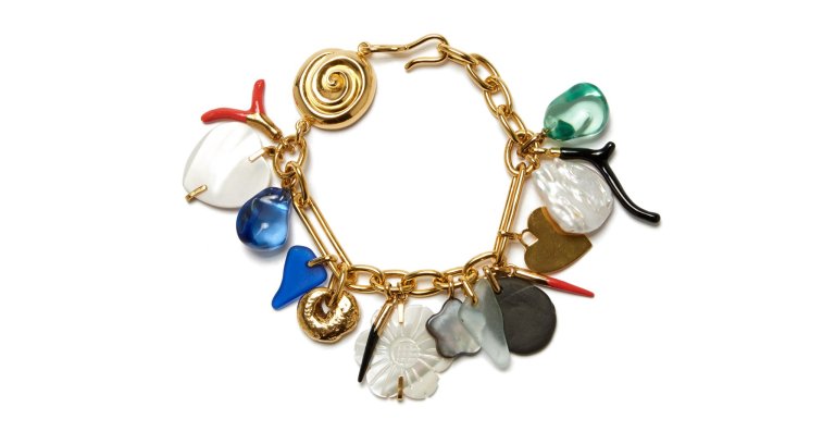 Fortunato’s site explains, “This heirloom-worthy chain-link bracelet is a veritable treasure trove of style. Its charms include an eclectic mix of hearts, shaped coral branches, sea glass, flowers, and more.”