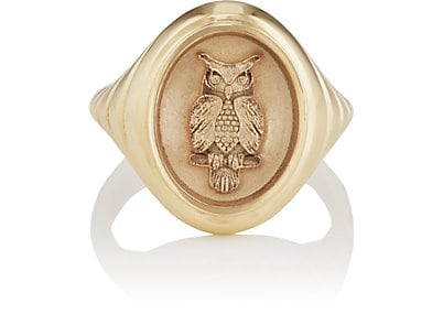 It is indeed a classic signet ring shape and design, showing an owl rendered in 14k yellow gold. Inside it bears the inscription “see things differently.”