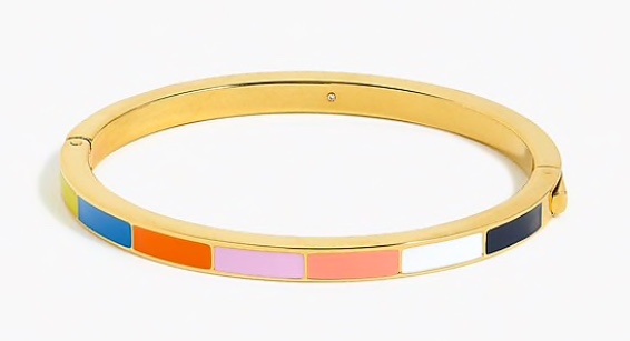 J. Crew has these bracelets in two sizes, and they are perfect for stacking. Even if you were to wear one alone, it packs enough of a punch with the bright enamel coloured stripes. There are also cute small hoop earrings which will complement the look without being too match match.