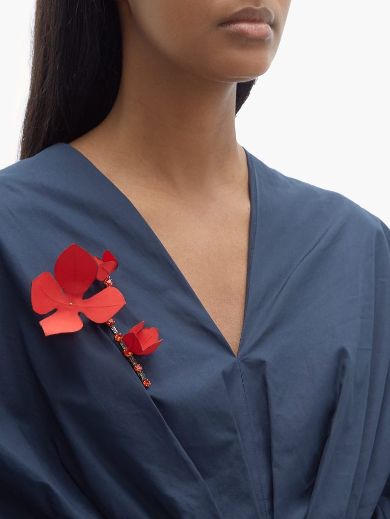 I’m beginning to feel cautiously optimistic that brooches might be making a comeback. This oversized pin by Marni ticks all the boxes for me – it has presence, being a robust 4 by 5 inches in size; a bit of sparkle, with red and clear crystal embellishment; and not too bad in price – USD$283. I would have styled this higher, up near the shoulder, but hey … points for effort.