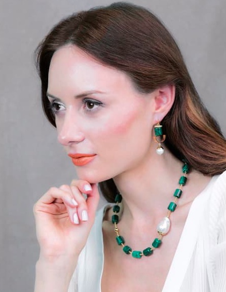 Available from Wolf & Badger, with an international online presence and shops in the US and UK, they explain, “This necklace was inspired by forest. It’s made of green tiger eyes stones with baroque pearl. Golden plated brass findings from Japan.”