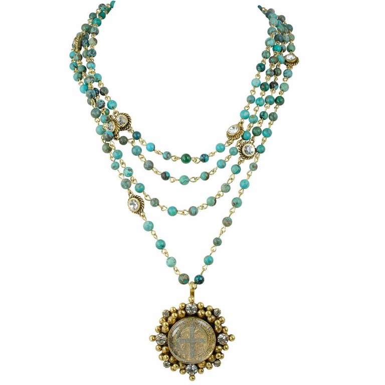 About this piece in particular: Luxurious natural turquoise beads are featured here in this classic 4 strand Magdalena necklace. Adorned with an elegant and refined San Benito Cloister pendant that brings peace and protection to all who wear it, this statement piece is sure to turn heads. Necklace measures: 16″-18″; large toggle closure. Wear long at 32″ as well