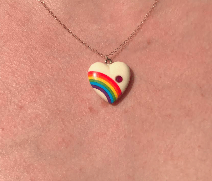 This is a fun reclamation of a vintage 1980s acrylic heart, repurposed with an added ruby.