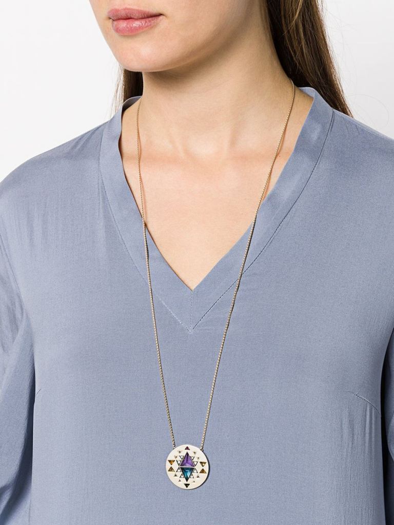 This bold piece comes from Noor Fares. Longer and larger than the typical pendant, it has great presence. It’s made with pink tourmaline, peridot, diamond and blue topaz set in 18k yellow gold and slips over the head. The pendant measures 1.3 inches and the chain is 30.7 inches.