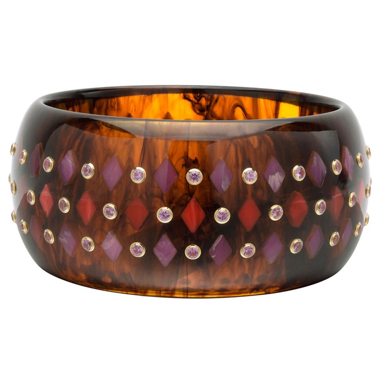 Mark Davis works with vintage pieces and breathes new life (and stones) into them. Here, “wide tortoise-colored vintage bakelite bangle with inlaid diamond-shaped vintage pink and red bakelite, accented by pink sapphires bezel-set in 18k yellow gold mounts. Pink sapphires weighing 4.62 total carats. Handmade in the artist’s Brooklyn workshop. Intended for medium-sized wrists (7.5″ approximate interior circumference).”