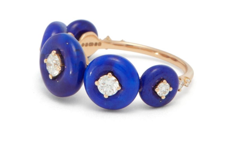 Available from Matches Fashion, they note, “This 18kt rose-gold Surrounding ring is part of Fernando Jorge‘s refined jewellery selection, which draws inspiration from his native Brazil’s ‘laid-back attitude and effortless sensuality’. It’s crafted in Italy and decorated with a striking combination of five lapis lazuli disks and nine sparkling diamonds of various sizes. Wear it to add a shot of sparkle to evening outfits.”