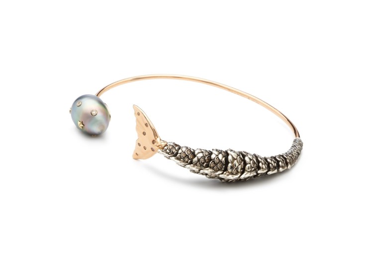 This oh so cool bracelet by Bibi van der Velden truly does look like a mermaid. Available from Auverture, it is “A highly-detailed mermaid’s tail curves around the delicate mermaid bangle. Designed in 18k rose gold and sterling silver, the open-ended bangle is crafted with the mermaid’s tail at one end and a Tahitian pearl at the other, with the piece embellished with white and brown diamonds.”