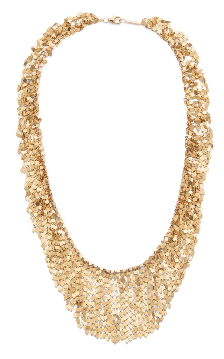 This fringe choker by Lana Jewelry is a more cost effective option than gold mesh. By Lana Jewelry, it is made with 14k yellow gold. As her site notes, “Cash in on fringe benefits. Go full-on luxe in layered, faceted fringe that catches the light like no other.” It’s part of a bigger collection of fringe pieces, should you be inclined to make it a set.