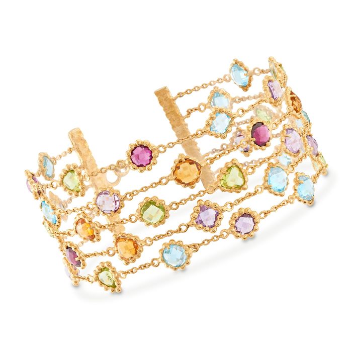 The company notes, “A rainbow of rich color! 23.70 ct. tot. gem. wt. of amethyst, citrine, peridot, rhodolite garnet and blue topaz gemstones dot the cable chains of this multi-row bracelet. Each faceted jewel is set in a beaded frame of 18kt gold over sterling silver. Includes 1 1/2″ extender. Lobster clasp, multi-stone bracelet.”