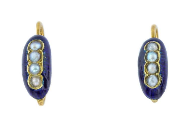 These delicate antique French enamel earrings are 18k yellow gold set with tiny seed pearls. They have a lever back so you won’t worry about losing them. From Etsy seller Lillicoco, these sell for USD$471.70.