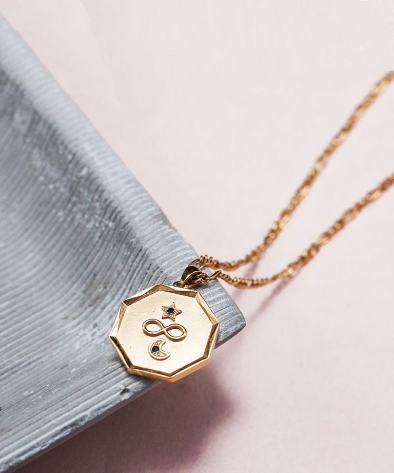 Edge of Ember has a number of intriguing charm type necklaces (among other designs). This piece, they say, “is a symbol of endless possibilities, the wildest dreams and biggest loves.” It is set with black sapphires, comes with a 19″ chain, and is made with gold plated sterling silver.