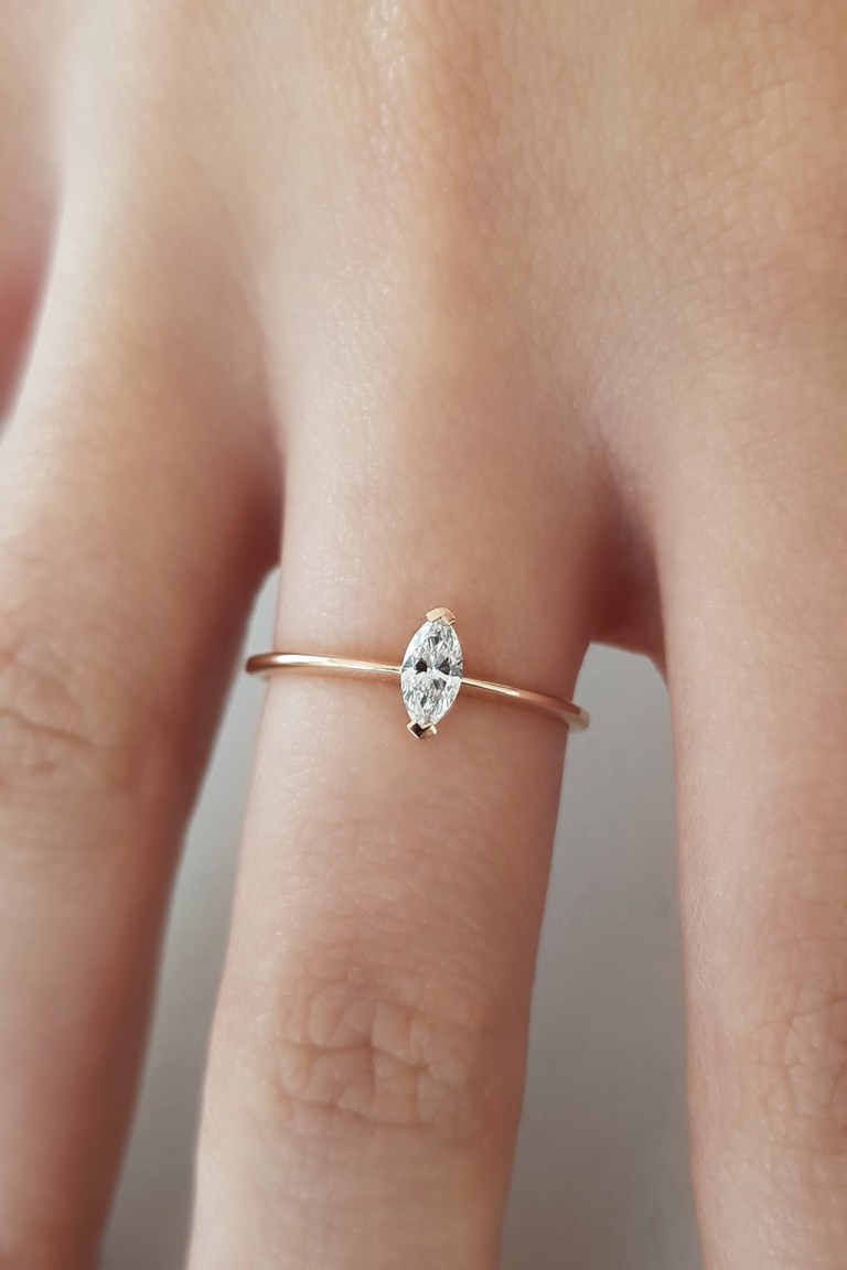 This ring is perfect for the minimalist – a simple slender gold band accented with a .20 marquise diamond. A little sparkle in an elegant setting.
