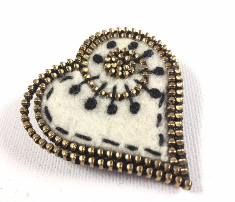 This is a fun way to reuse old materials: a zipper has been applied as the outline and basis for the brooch, with an embroidered white felt centre. It’s simple but pretty.