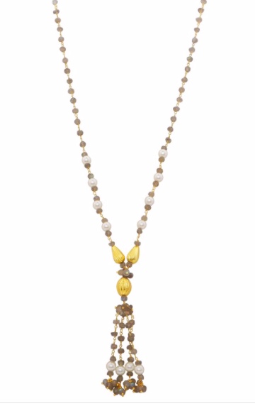 This is the kind of piece that can be worn equally well casually or for dressier occasions. It’s made with labradorite and pearls set in 925 sterling sliver and 22 carat gold plated. The tassel is accented with faceted labradorite stones.